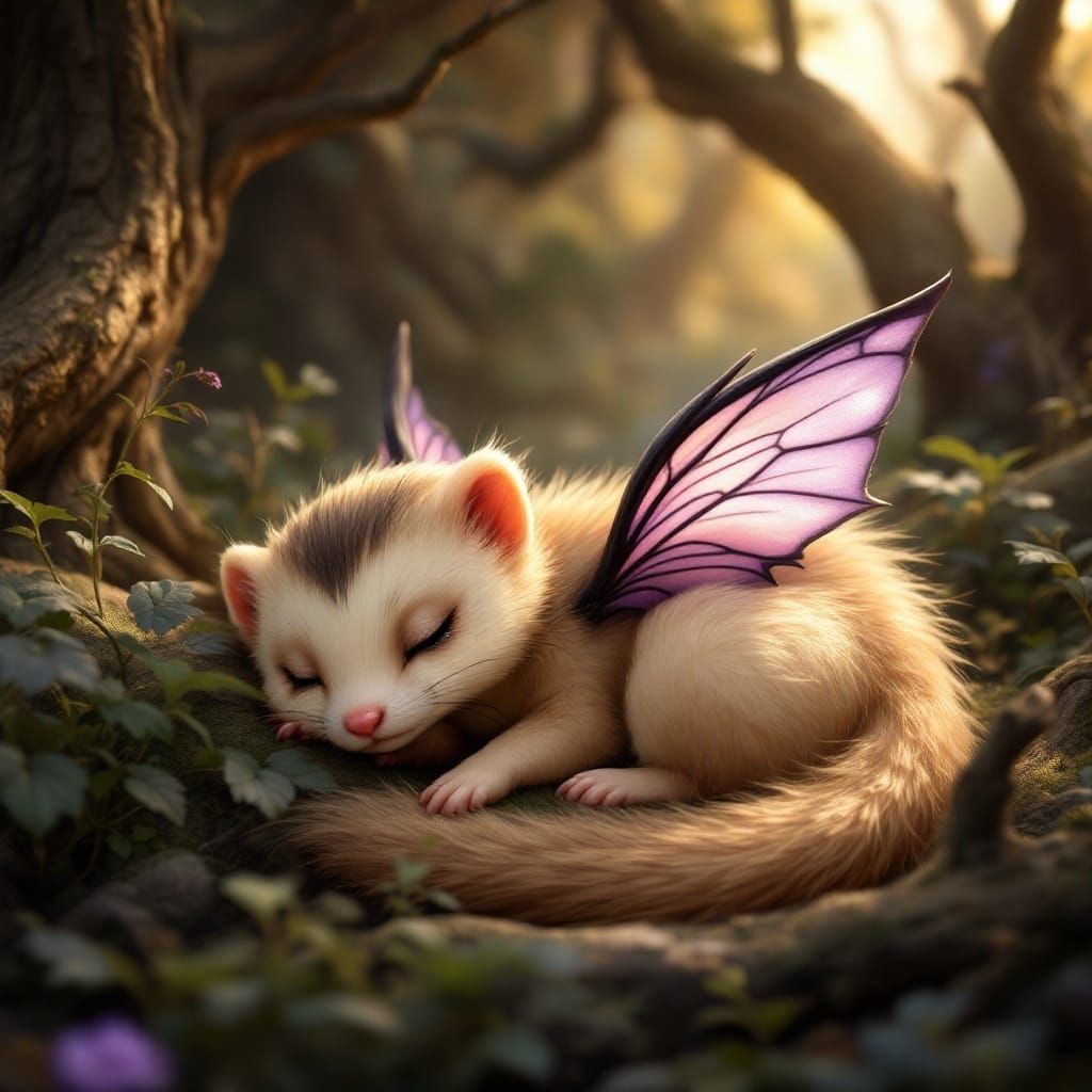 This serene fantasy image depicts a slumbering, ferret-like creature with delicate wings, surrounded by ancient trees and lush foliage in a warm, golden light. The creature's fur and wings exude a soft, mystical quality, with intricate textures and subtle color gradations.