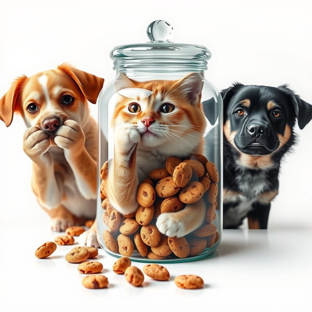 This captivating image combines diverse scenes into a single, aesthetically pleasing composition. A translucent cat reaches for a cookie, while anthropomorphic dogs react with adorable expressions, set against a backdrop of balanced colors and harmonious light.