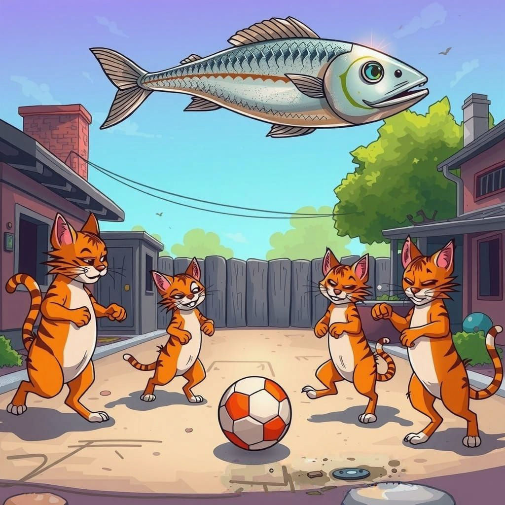 "A bunch of stray cats playing soccer in a back street yard. They stand on the two rear legs in humanized pose and the scene is full of intense action and dynamism. The general feeling is cartoonistic and the cats all have a tiger orange fur of various shades and decorations. There is only one ball shown, looking worn out and old fashioned. Their prize will be a giant platinum sardine hovering the playground, splash art, mid shot, poorly detailed, color depth, dramatic, 2/3 face angle, side light, colorful background <lora:Tiger model:1.0>"