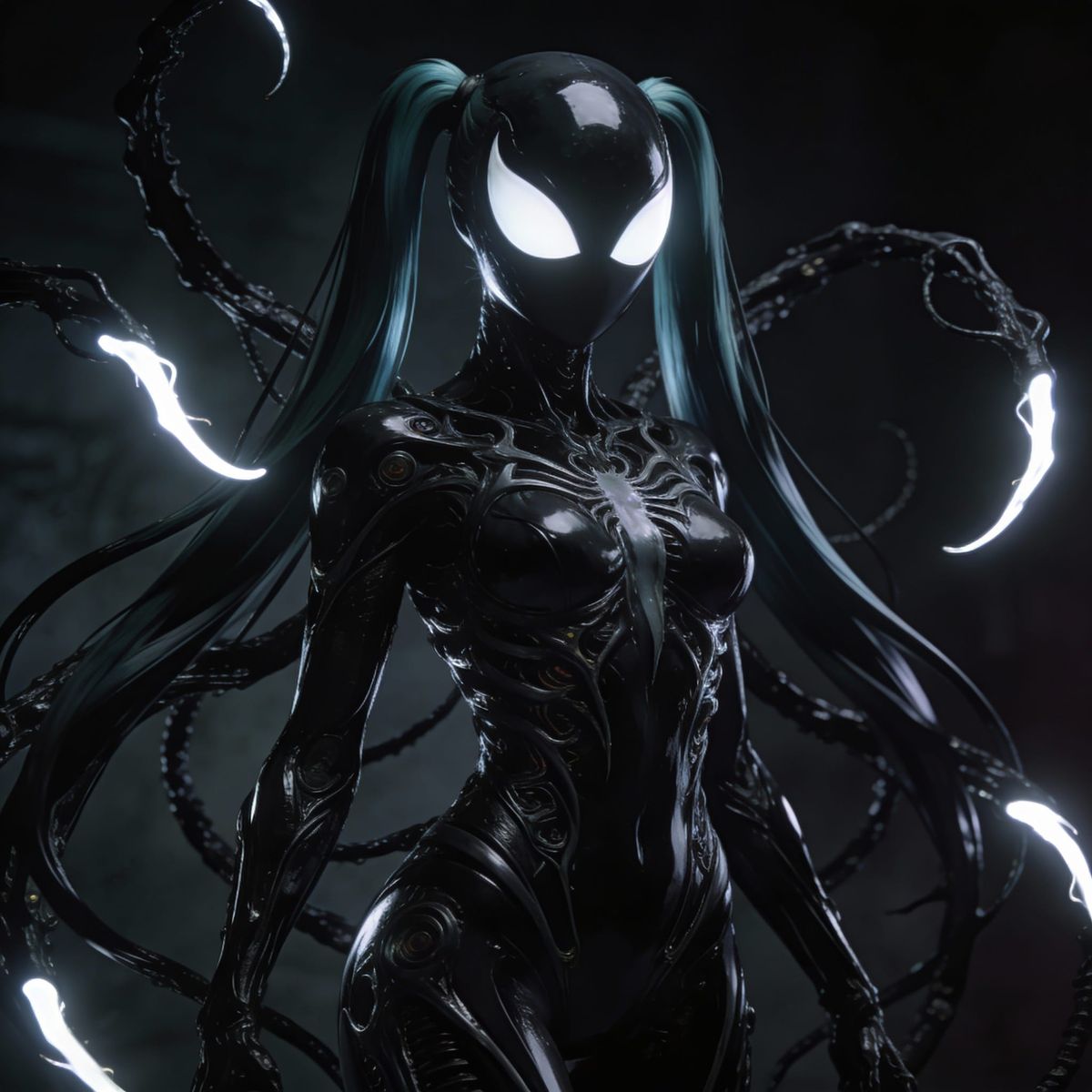 This image shows Hatsune Miku consumed by a black symbiote, creating a biomechanical, feminine form. Features dark, moody lighting with glowing white accents, rendered in a detailed digital art style.
