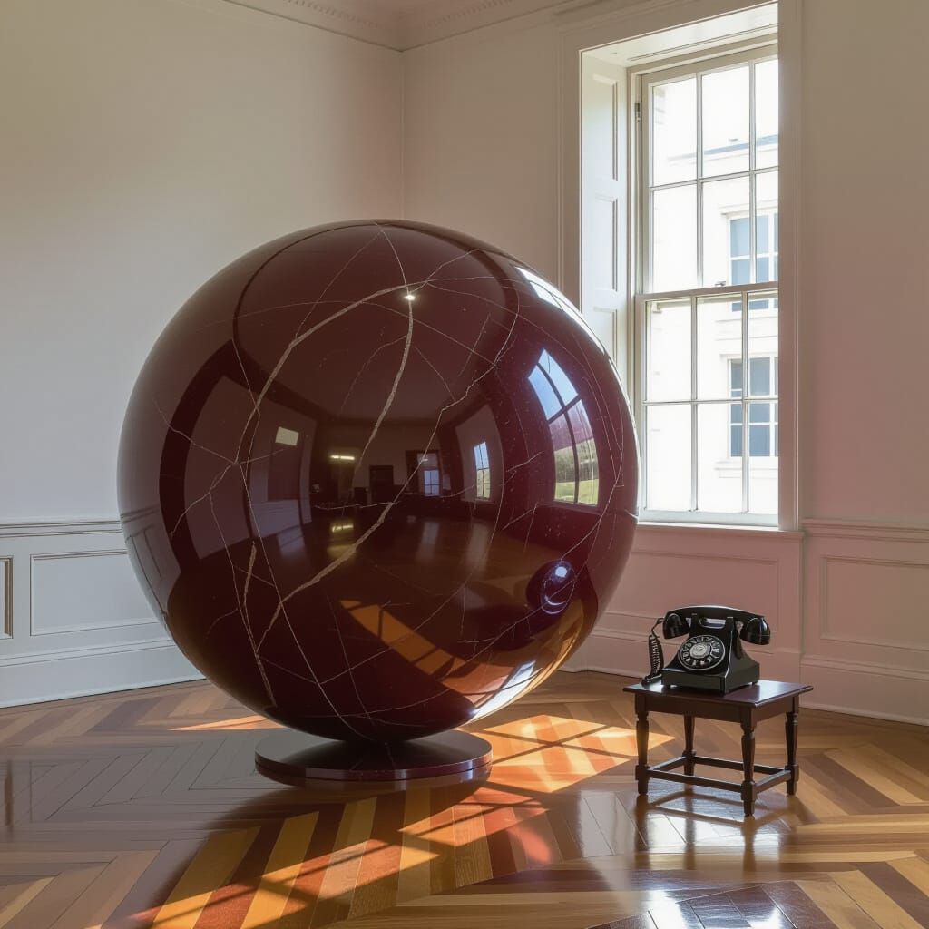 This image depicts a massive, gleaming maroon marble sphere in an empty room with moonlight and an old-fashioned telephone. Created in a neo-surrealistic style with dramatic lighting.