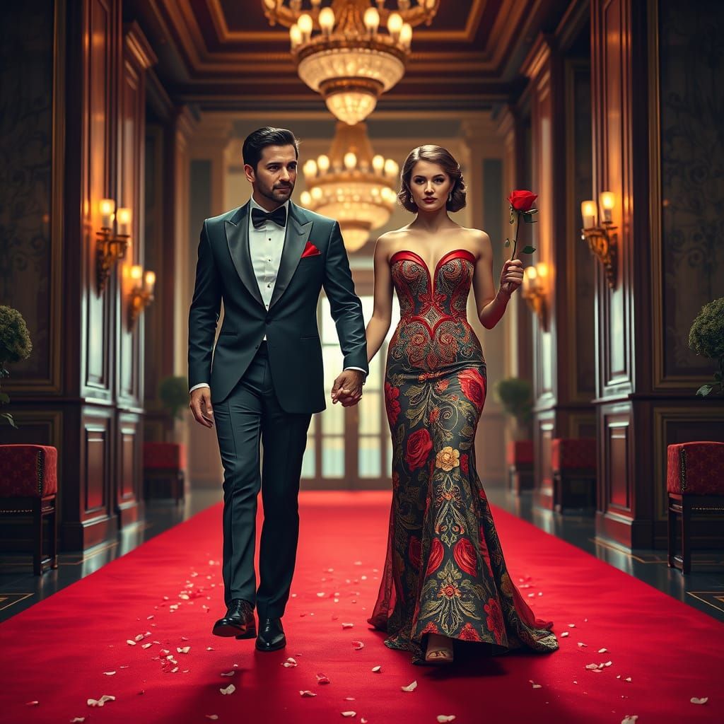 This image captures a sophisticated couple walking hand in hand on a luxurious red carpet, surrounded by opulent hotel decor and vibrant rose petals, with a hint of classic Hollywood glamour and Art Deco flair.