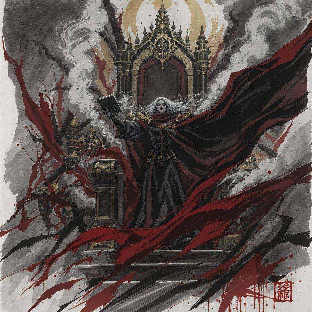 This image depicts Elara, in D&D style, presenting a ledger before the Iron Chancellor. Steam-powered enforcers loom behind her in an ink drawing with gray, crimson, and gold tones.