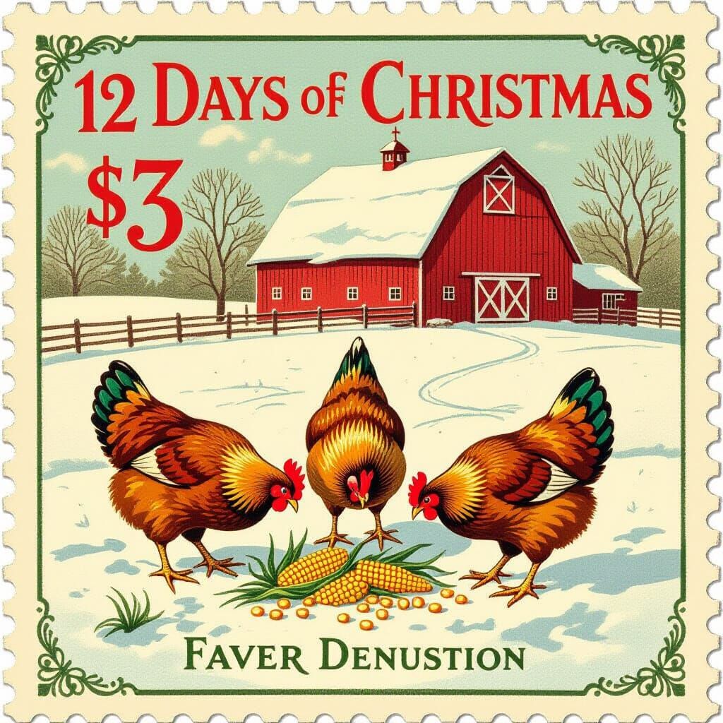 This image shows a vintage "12 Days of Christmas" postage stamp with a prominent $3 denomination. It features three Faverolles chickens pecking corn in a snow-covered barnyard, rendered in early 20th-century stamp art style with warm colors.