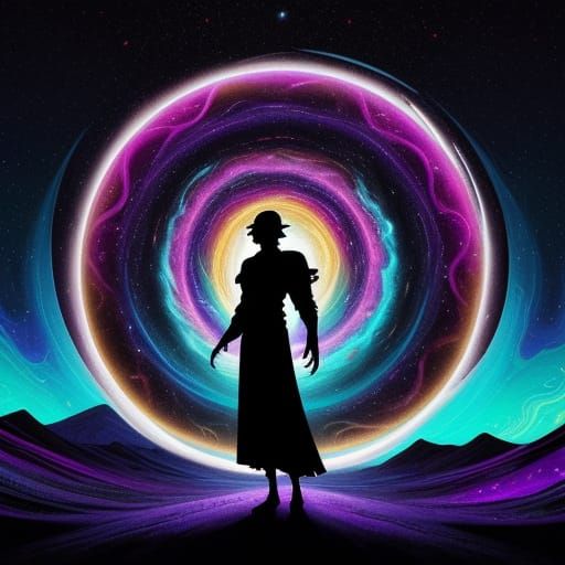 A lone figure on a desolate plain under a cosmic sky, rendered in a psychedelic art nouveau style with vibrant nebulae and shimmering details. Features high-contrast purple and gold lighting.