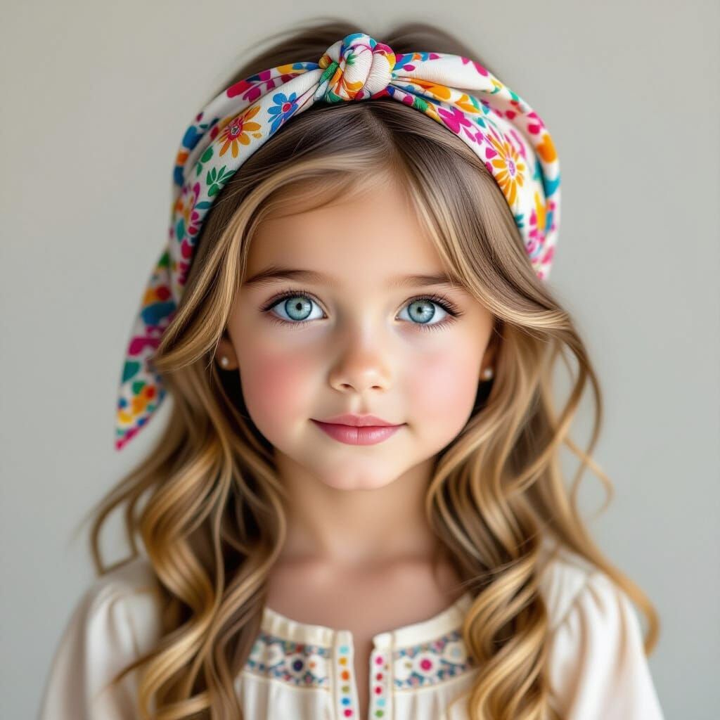 This image features a young girl with long, wavy blonde hair and a vibrant headscarf. Her large blue eyes and patterned dress are highlighted against a simple background, showcasing her delicate and whimsical appearance.