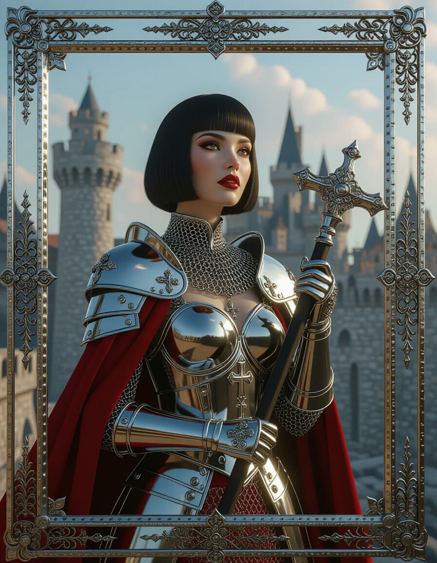 A digital portrait of a young female cleric in silver chainmail. The image features dramatic lighting and ornate details, rendered with a dark fantasy aesthetic. The character is set against a castle backdrop.
