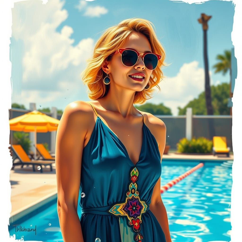 This image shows a woman in a sundress and sunglasses by a swimming pool, her shoulders sunburned. The artwork captures a summer day with bold brushstrokes and vibrant colors, in a style reminiscent of Hockney's paintings.