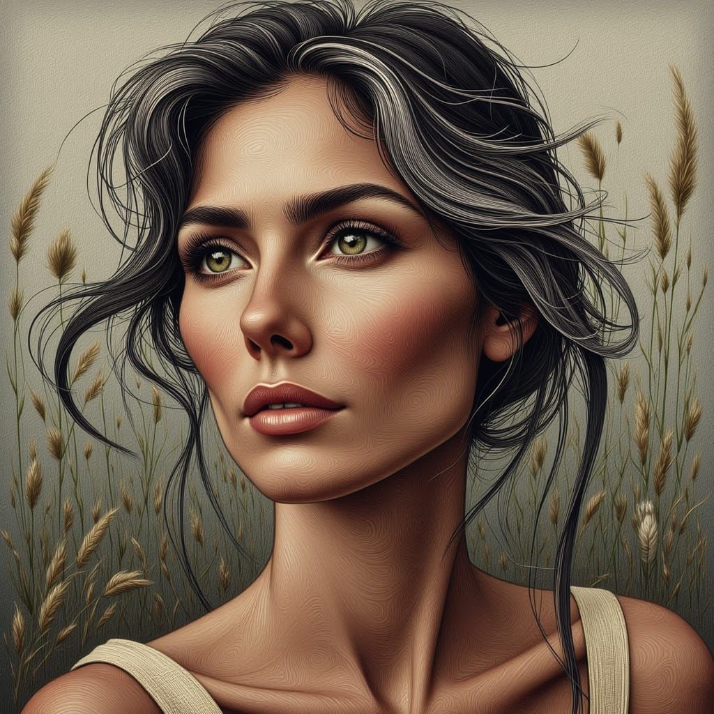 A striking, super-realistic portrait of a slender woman with dark hair and silver highlights, set against a muted, earthy backdrop, blending emotive, distorted forms and vivid, clashing colours in a dynamic, neo-expressionist aesthetic
