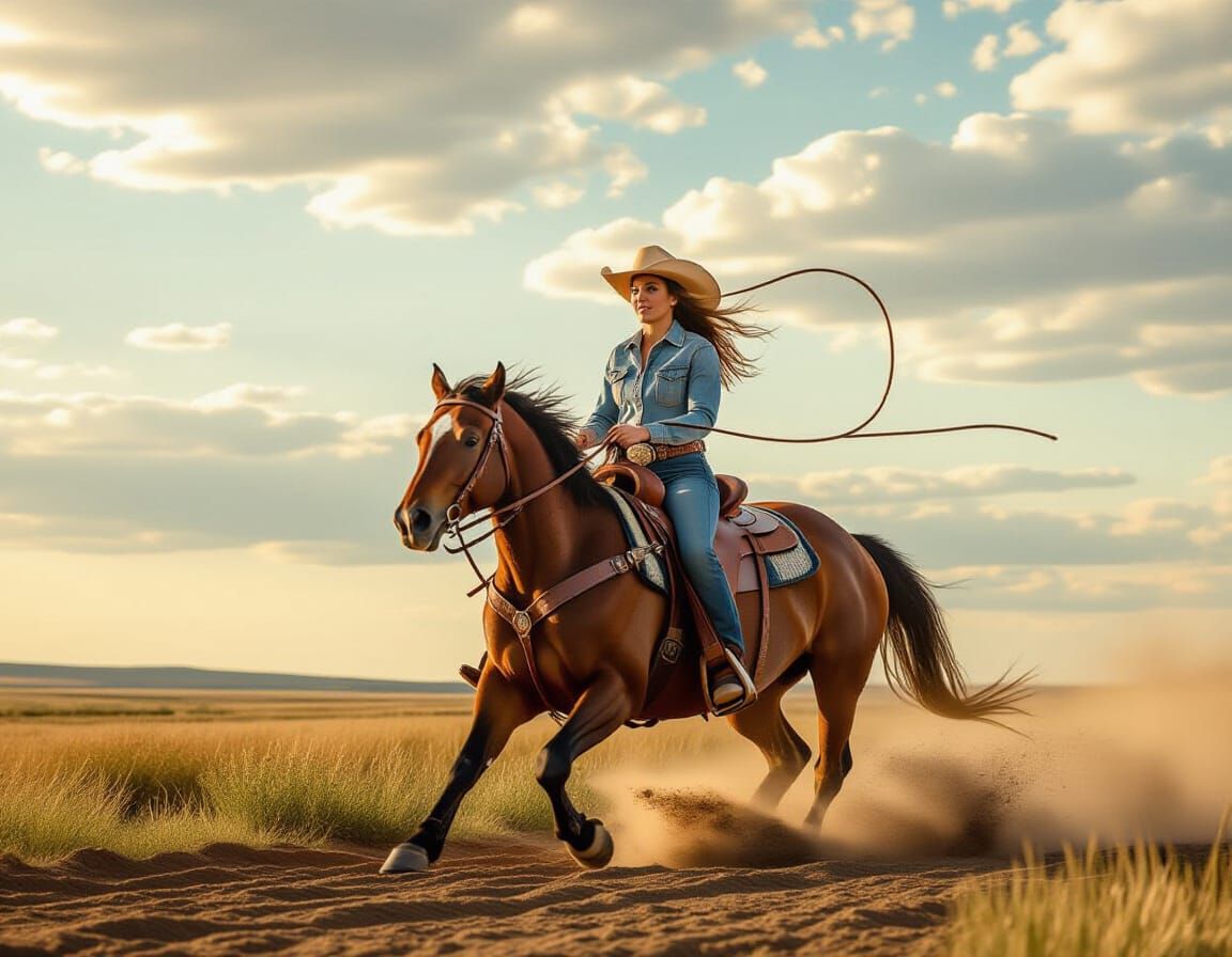 A photorealistic image of a cowgirl on horseback, swinging a lasso on a dusty prairie. Captured in golden hour light with a wide-angle lens for a cinematic Western feel.