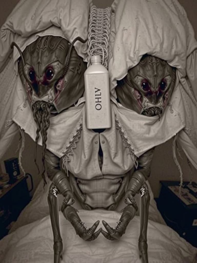 This haunting image depicts a towering, humanoid spider hybrid, infected with Cordyceps, bursting forth from under a bed at dawn. Rendered in hyperrealistic black and white, with intense lighting and atmospheric shadows, this dark, unsettling scene evokes the works of H.R. Giger and Zdzisław Beksiński.