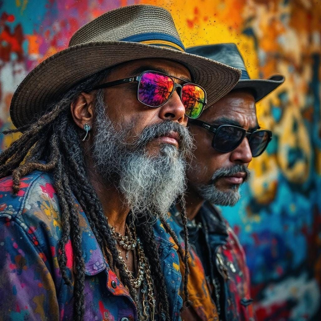 A striking picture of Latino street thugs captured in a hyperrealistic style. The image features a shallow depth of field, natural lighting, and a colorful background, reminiscent of impressionist paintings.