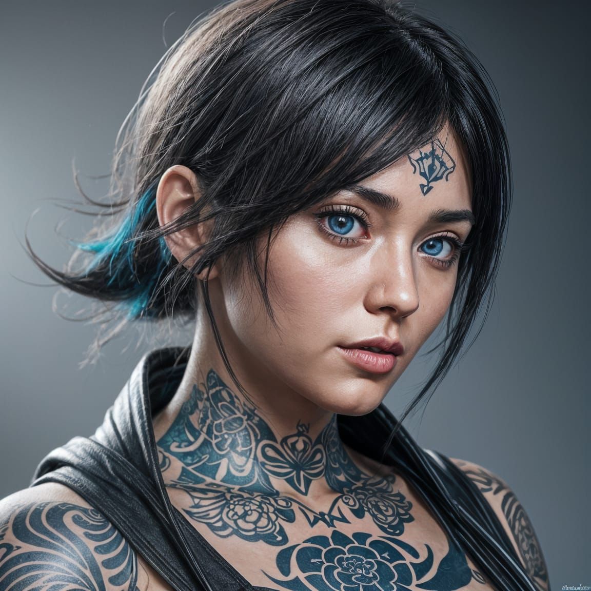 This image shows a Latina woman with striking blue eyes and short black and white hair. She has tattoos and is wearing a black bikini, rendered as detailed 3D anime art.