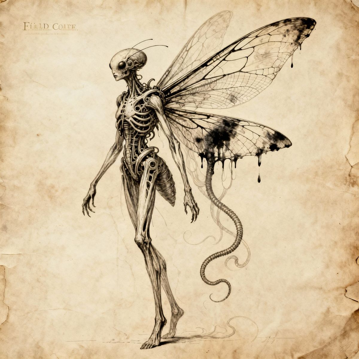 This image is an intricate sepia ink anatomical sketch of a lanky fairy with insect wings, in the detailed, ominous style of romantic horror etchings.