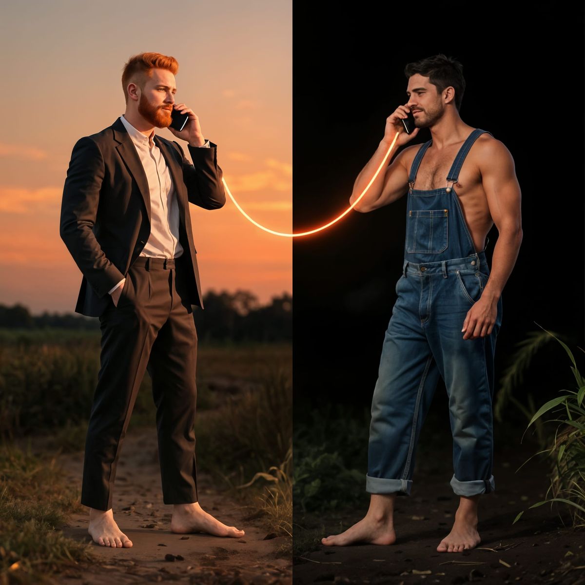 A professional photo shows two distinct ruggedly handsome men, one a redhead academic and the other a black-haired farmer, each on a mobile phone. A neon thread links their devices.