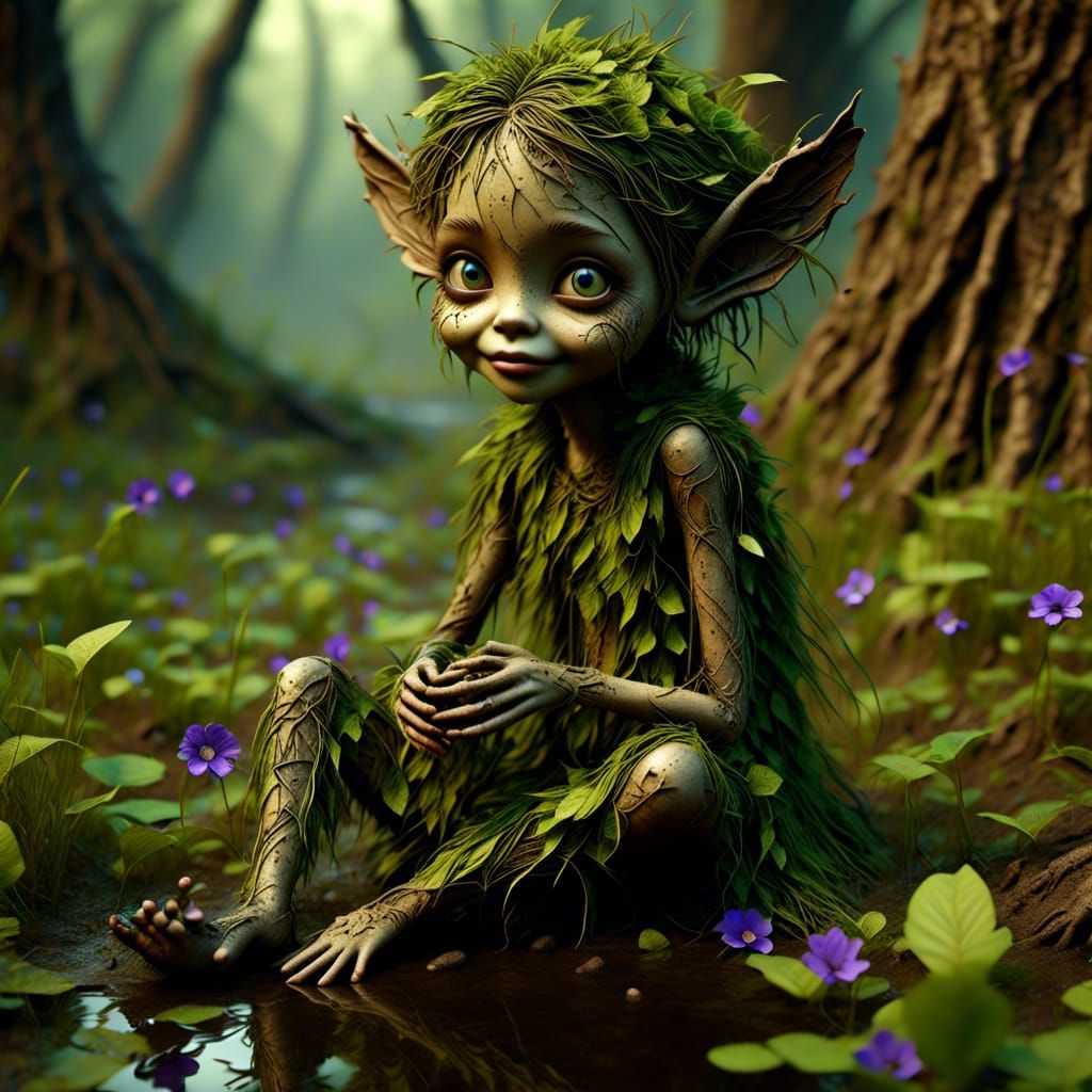 This image shows a cute mud-sprite sitting in a bog, planting violets under a weeping willow tree. The sprite has muddy clothing and a happy expression, rendered with photorealistic details and 3D shading.