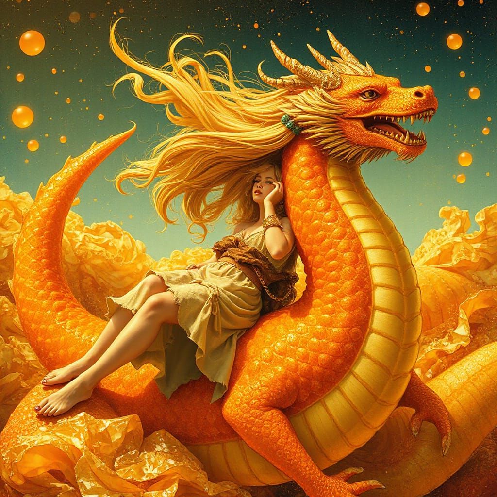 A woman with golden hair in bohemian attire rides a giant gummy dragon through a dreamlike soda sea, featuring warm amber and tangerine tones with intricate patterns.