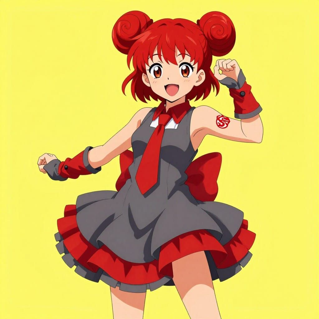 This vibrant image features a joyful anime girl with distinctive red tornado-shaped drills for hair, a grey skirt, and dynamic cel-shaded lighting. The background is a bright yellow, reminiscent of Japanese aesthetics.