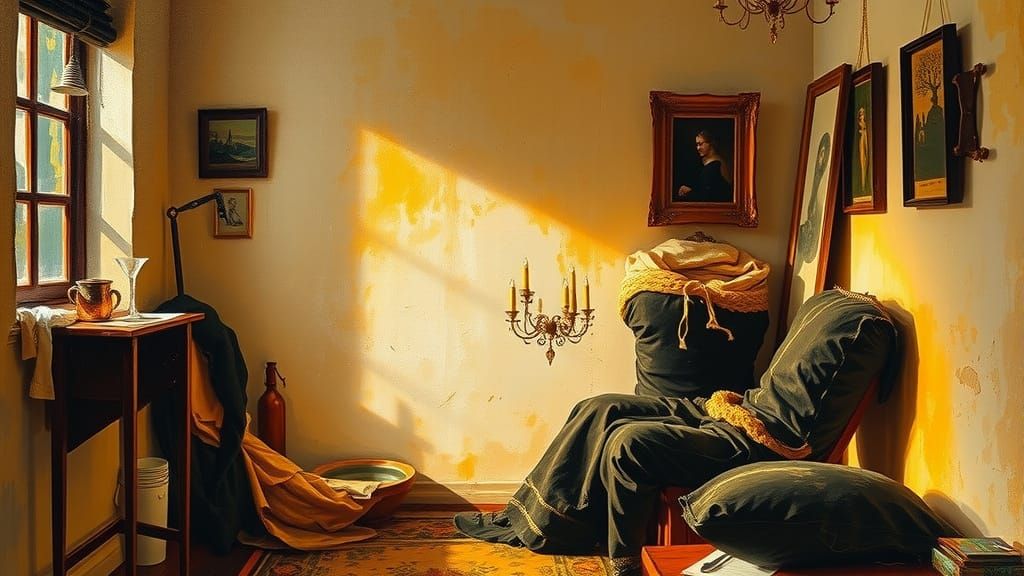 This oil painting captures a serene, everyday scene in a warm, golden light, reminiscent of the Old Masters' style, with soft brushstrokes and a muted, earthy color palette featuring milk white, honey orange, and tea brown hues.