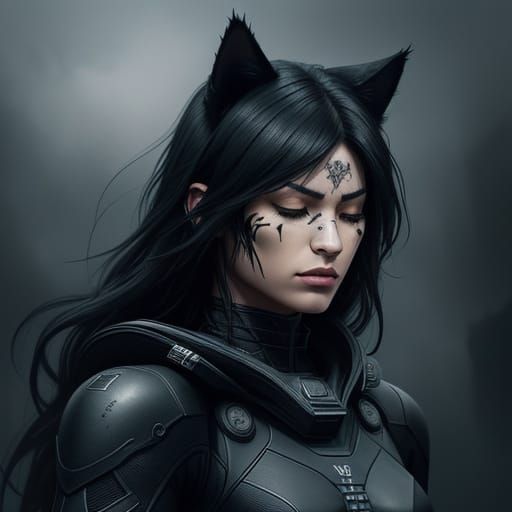 This image shows a concept art piece of a girl with black hair and cat ears, wearing a tactical suit. The digital painting features realistic rendering, moody lighting, and a dark, atmospheric background.