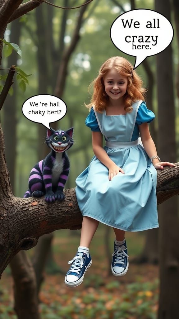 This enchanting image depicts Alice sitting on a tree branch in a whimsical forest, surrounded by fantastical elements reminiscent of the classic tale, but with a modern twist and photorealistic style.