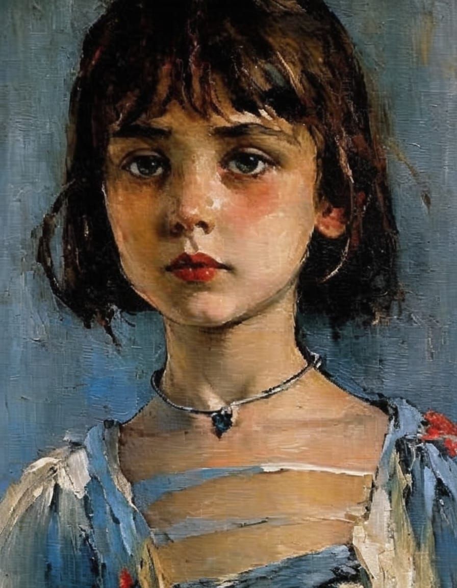 This hyperdetailed portrait captures a sad gothgirl with short hair and big eyes, rendered in an impasto style with high contrast and depth of field.