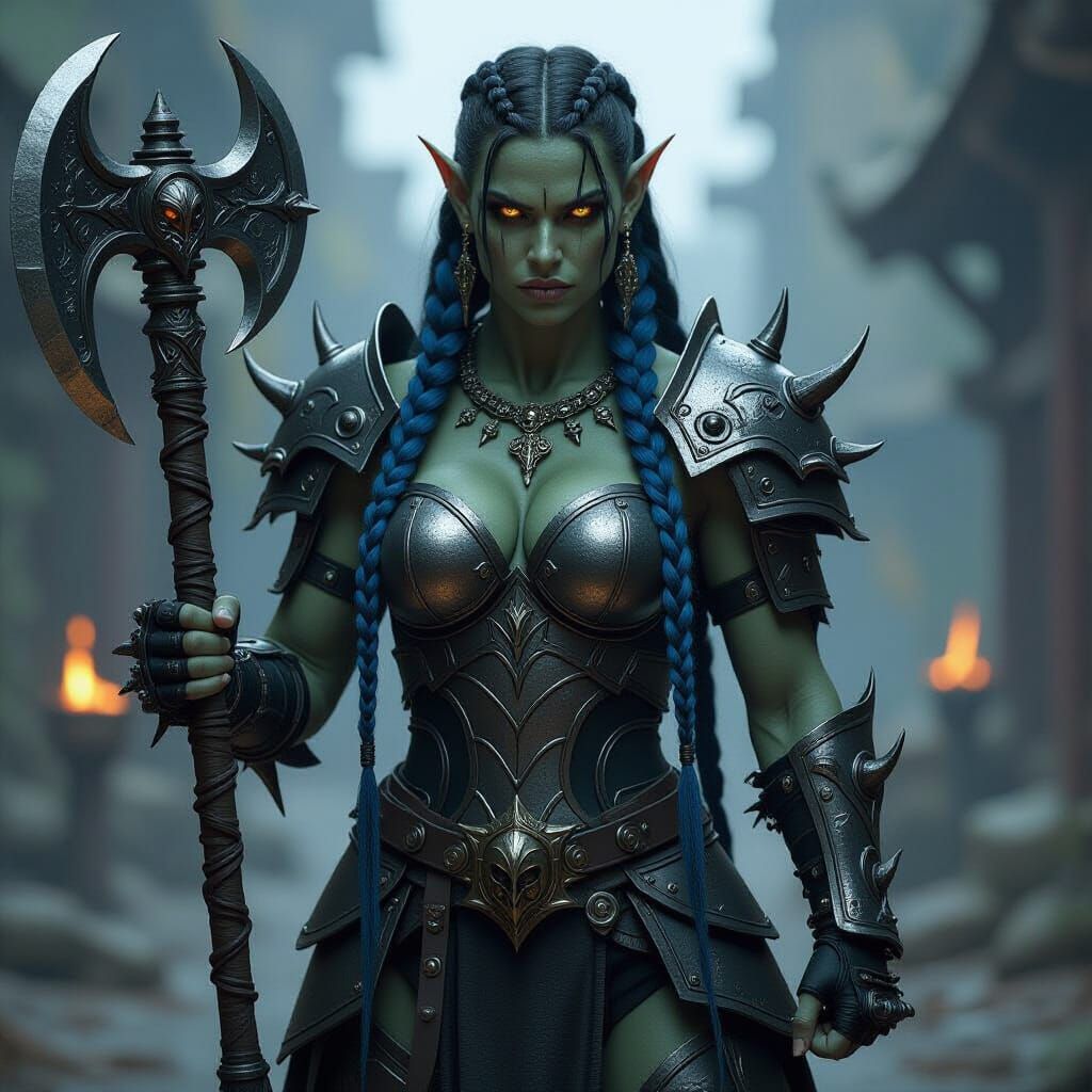 This image shows a powerful, muscular female Orc warrior in detailed medieval armor with demonic horns. She holds a massive battle axe in a sinister, smoky cemetery setting.