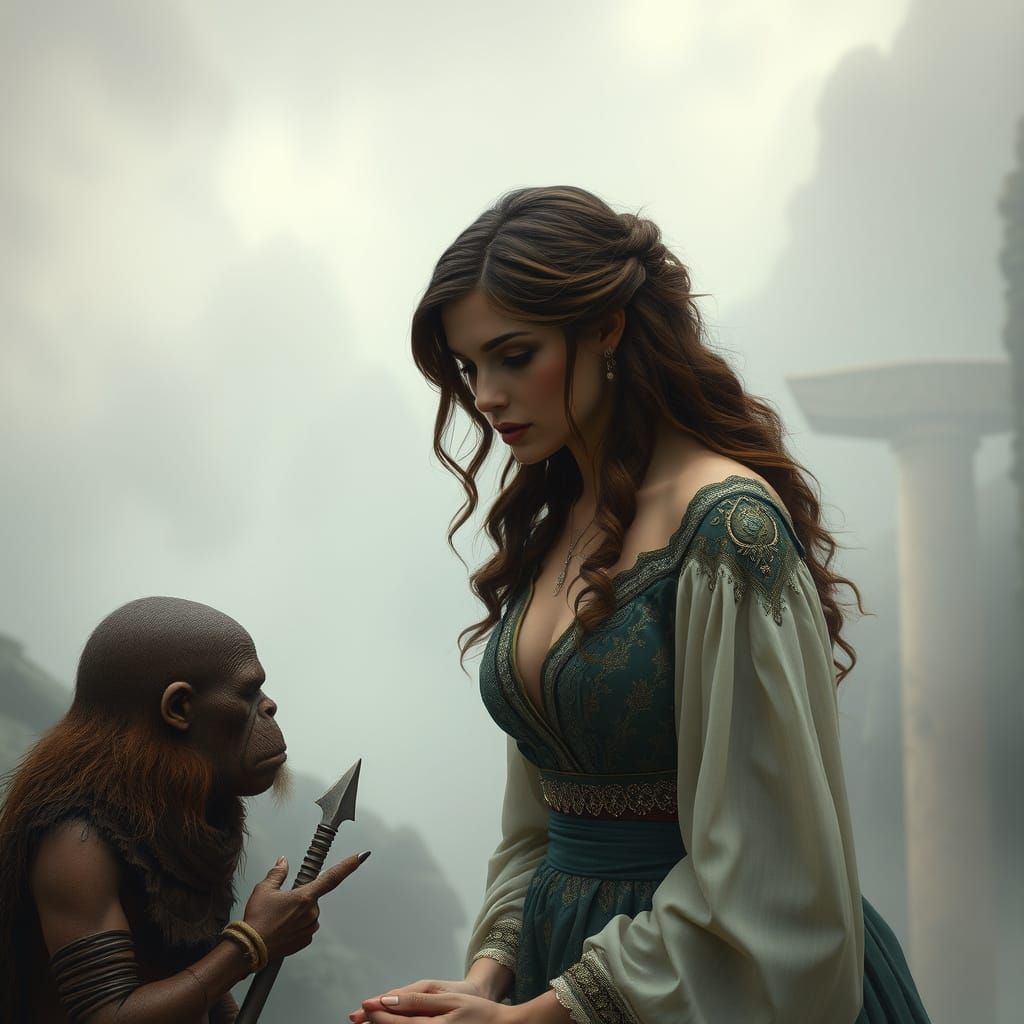 This hyperrealistic image shows an elegantly dressed woman speaking to a Neanderthal warrior. It features cinematic lighting and emotive expressions, rendered with intricate detail.