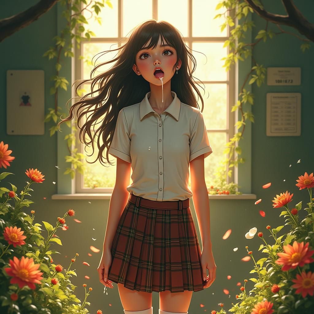 This image shows a schoolgirl in uniform with milk on her face, set in a fantastical high school environment. The image features warm lighting, lush greenery, and bold composition, with hyper-realistic textures.