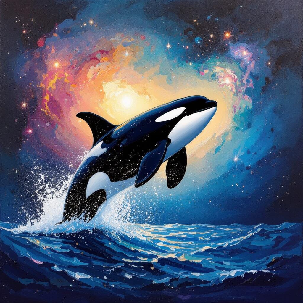 This image shows an orca whale leaping from a swirling, iridescent nebula sea, set against a backdrop of galaxies. Rendered as an expressionist oil painting with bold strokes and dramatic lighting.
