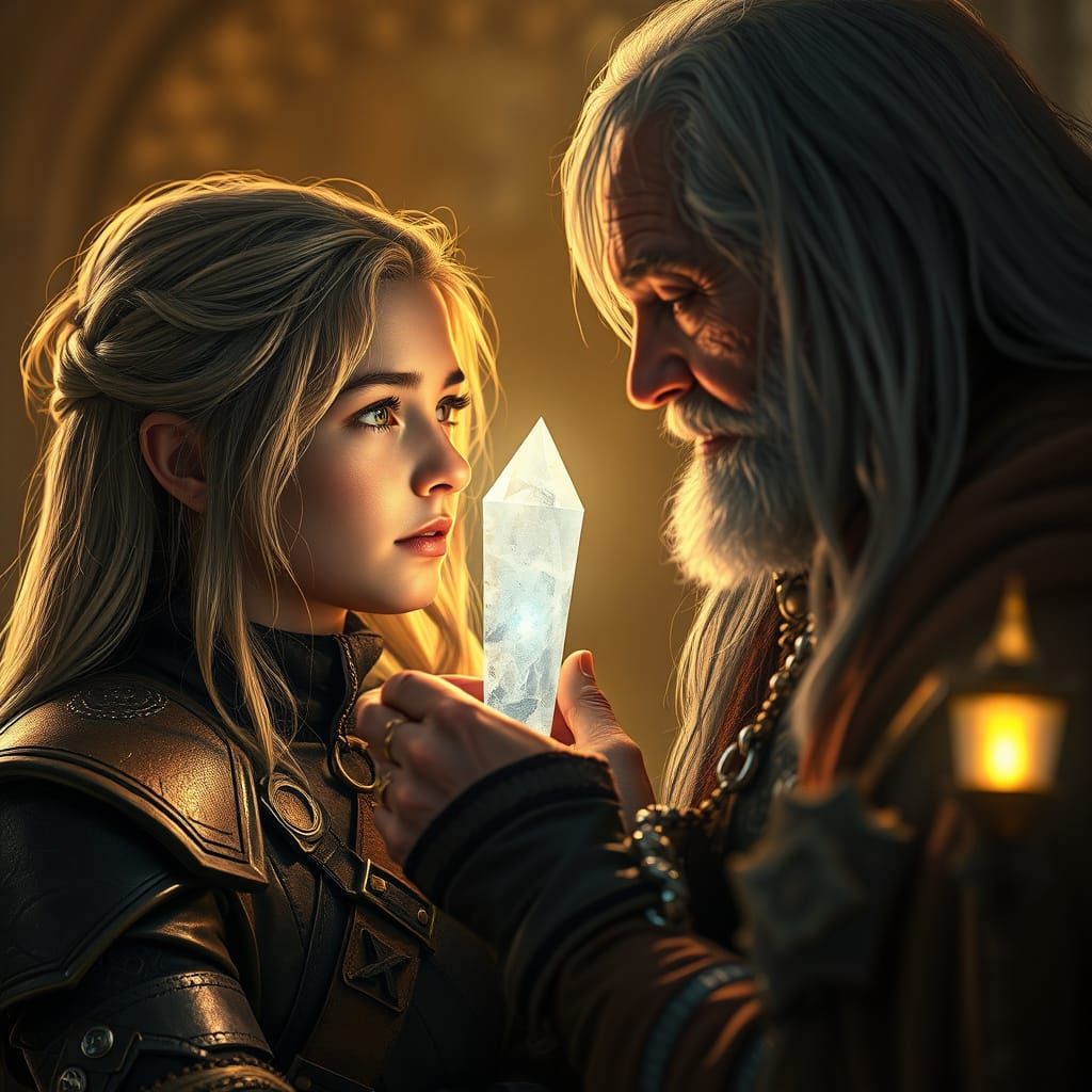A dramatic scene of a mystical transfer of knowledge and a symbolic passing of the torch. This image shows a blend of high fantasy and cyberpunk aesthetics, with glowing runes and ancient artifacts guiding the way.