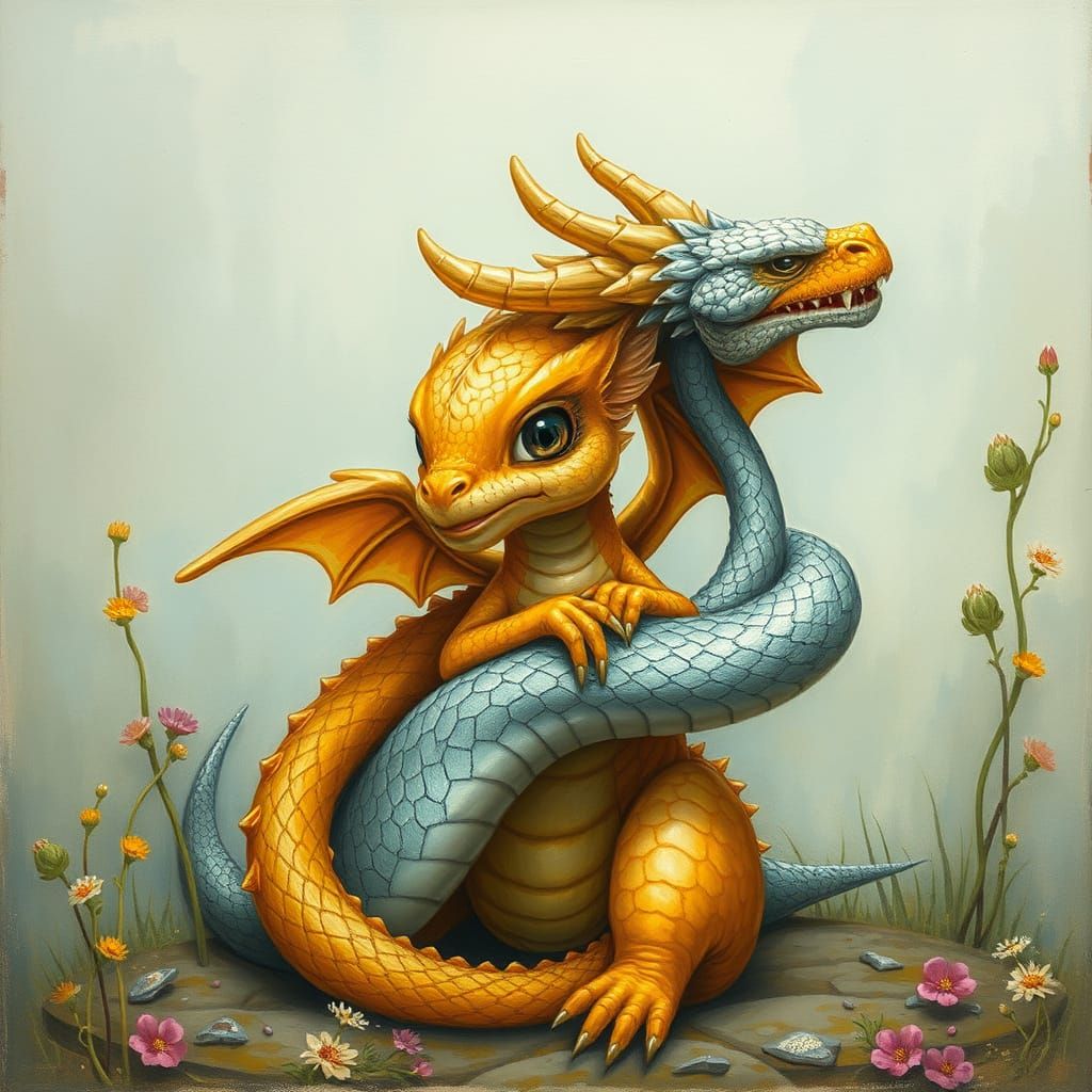 A captivating image of a golden dragon entwined by a silver snake. The artwork showcases delicate textures and expressive brushstrokes in a whimsical, dreamlike setting. An illustration in a gouache style.