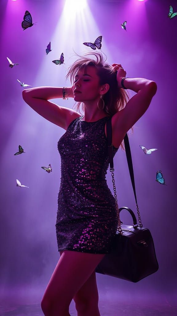 This striking image features a cyberpunk woman with messy hair, eyes closed, posing dynamically in a studio. Butterflies flutter around her, illuminated by dramatic backlighting, creating a dreamy, photo-quality effect.