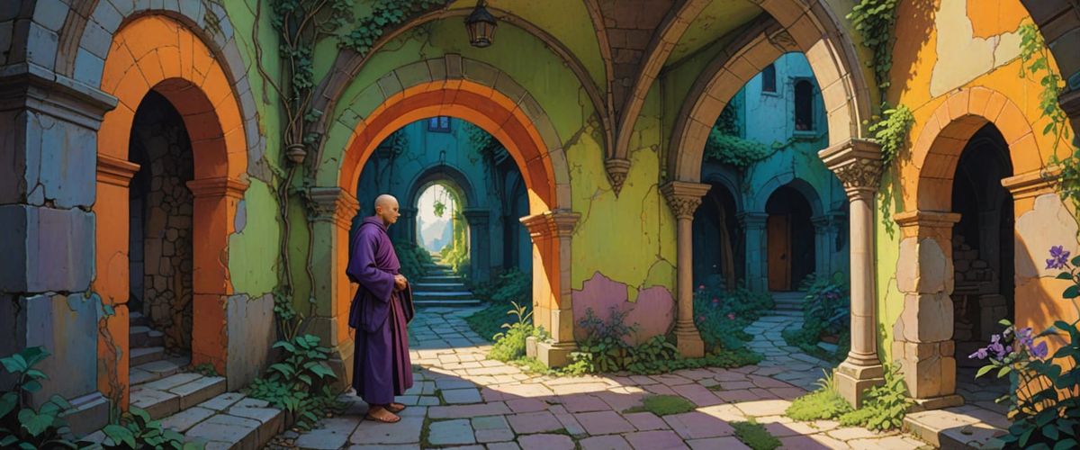 A whimsical fantasy illustration of a monk in an abandoned passageway. The art style is reminiscent of soft pastel paintings, with volumetric lighting and bright daylight creating chiaroscuro shadows.