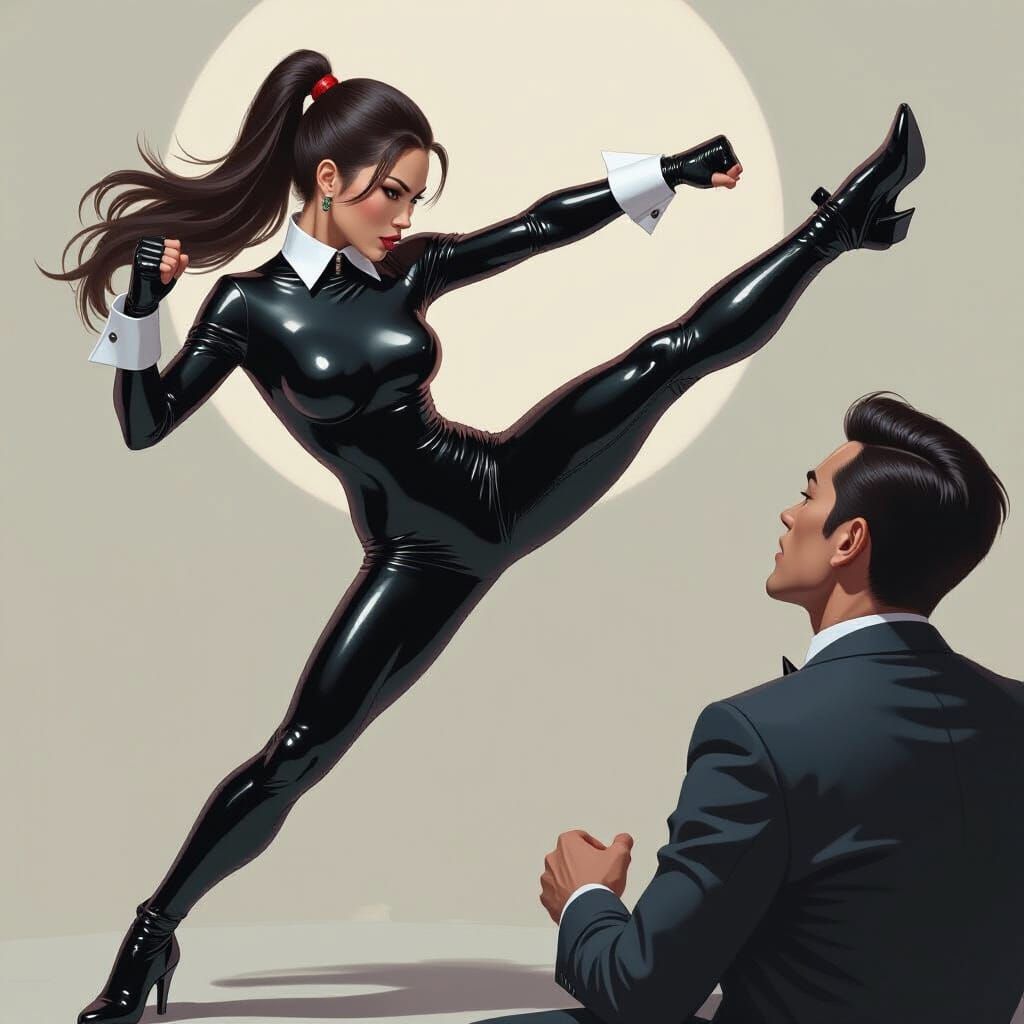 A striking image of an Asian woman in a black latex catsuit performing a dynamic martial arts kick. The art style blends vibrant colors with gritty realism and futuristic neon lighting.