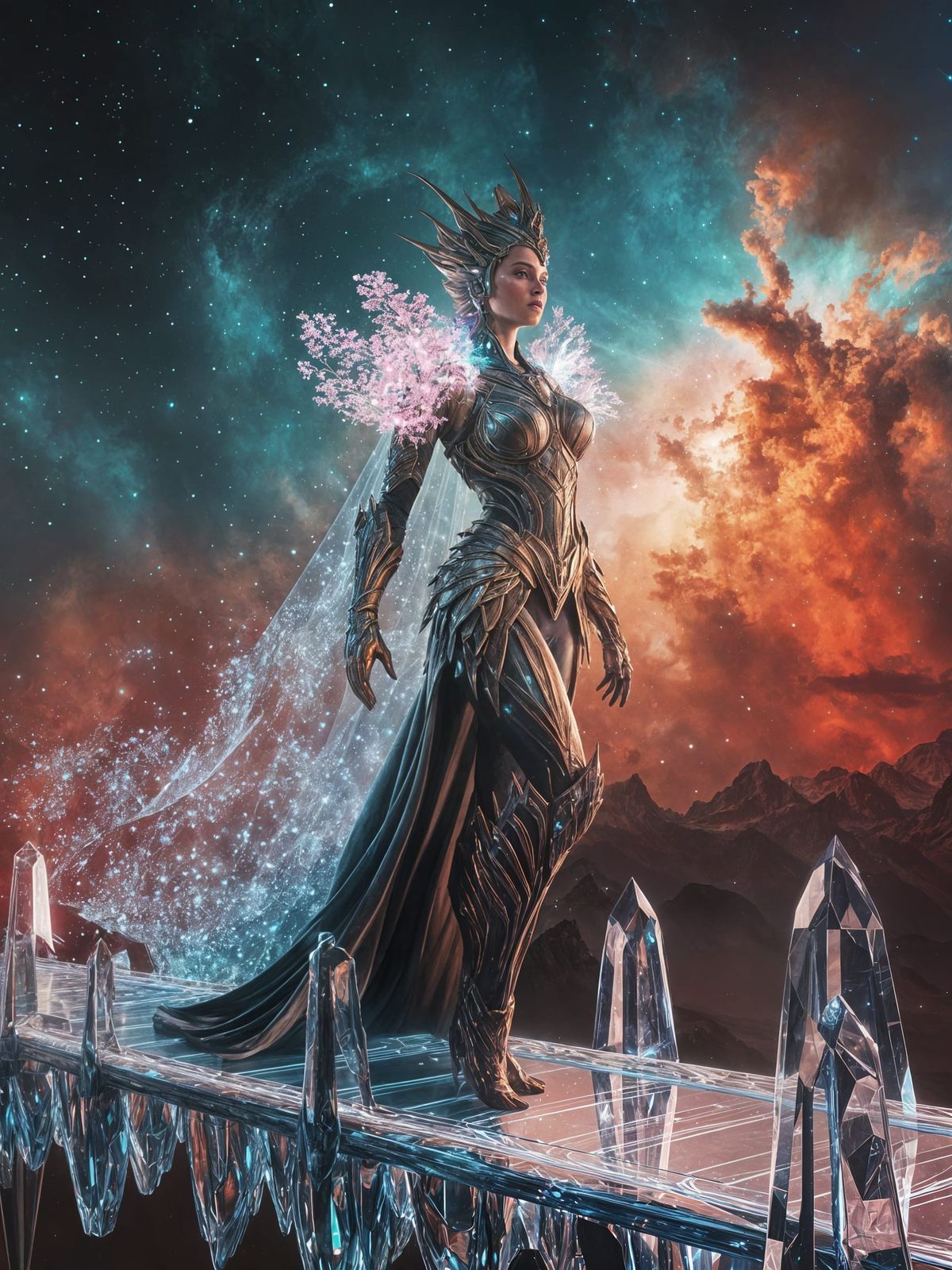 This image shows a queen with glowing flora armor on a bridge, gazing at a nebula sky. Fantasy concept art meets abstract elements in this cinematic digital matte painting.