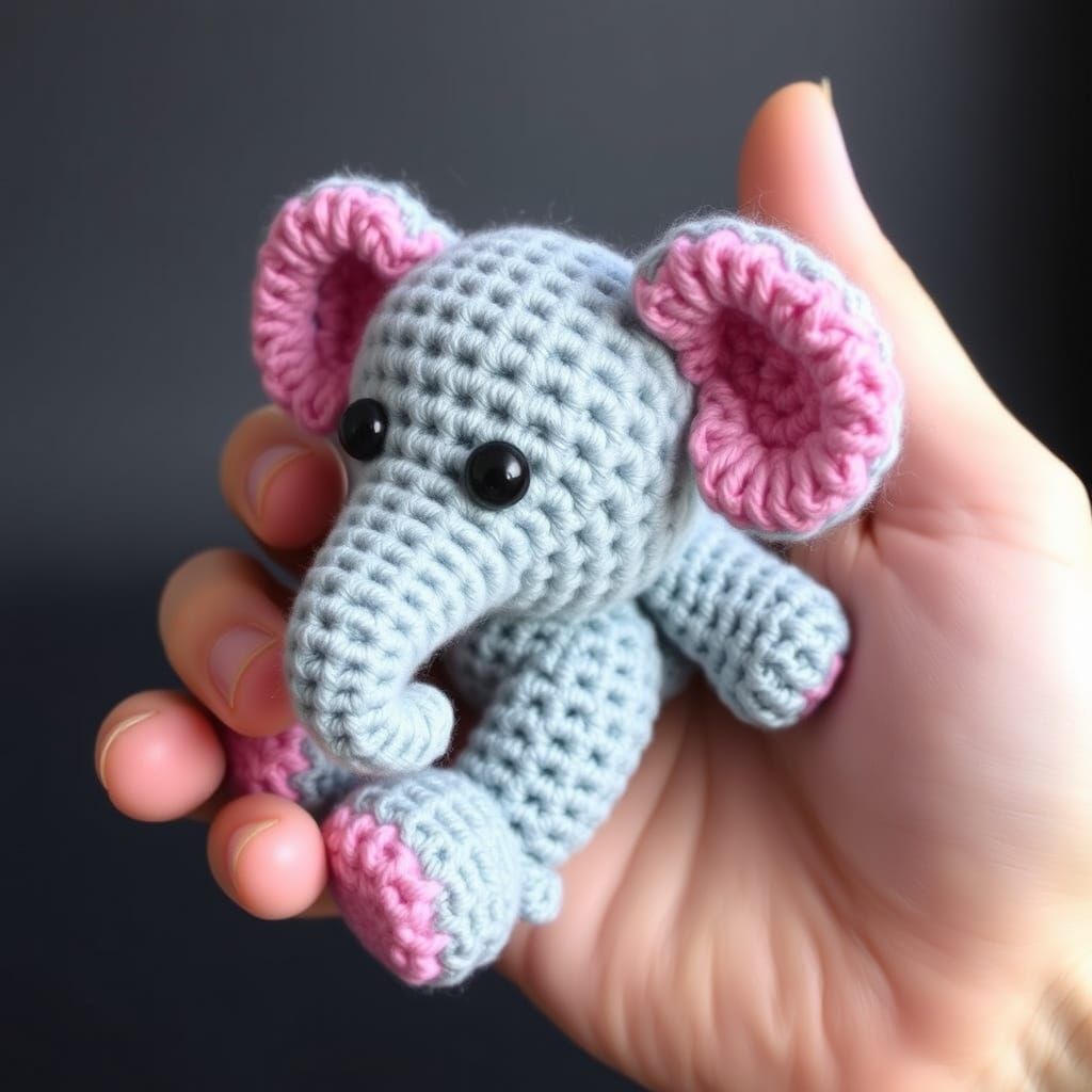 A charming, detailed image of a crochet elephant crafted entirely from yarn. The texture of the yarn is clearly visible, giving a soft, handmade feel to the adorable creature.