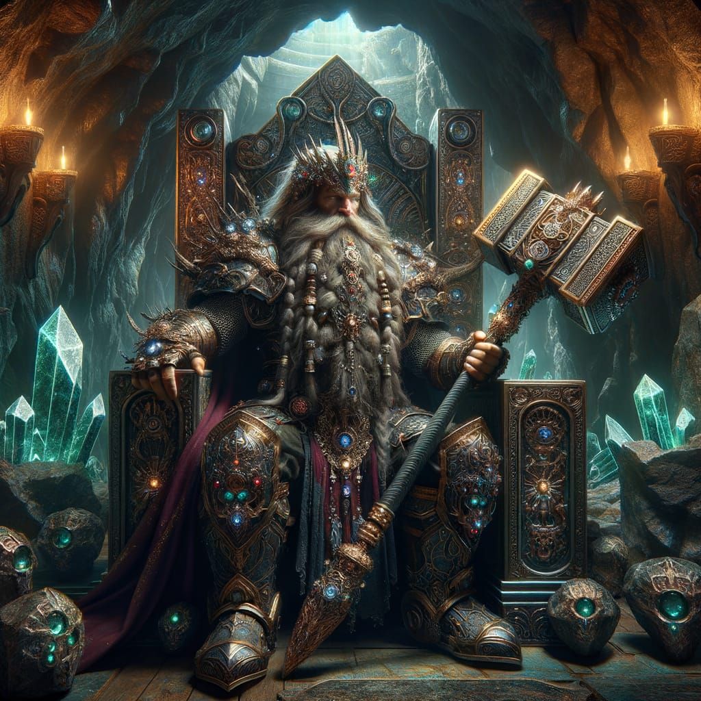 A regal and mighty Dwarf King sits upon his throne in his mountain hold surrounded by stone and crystal
