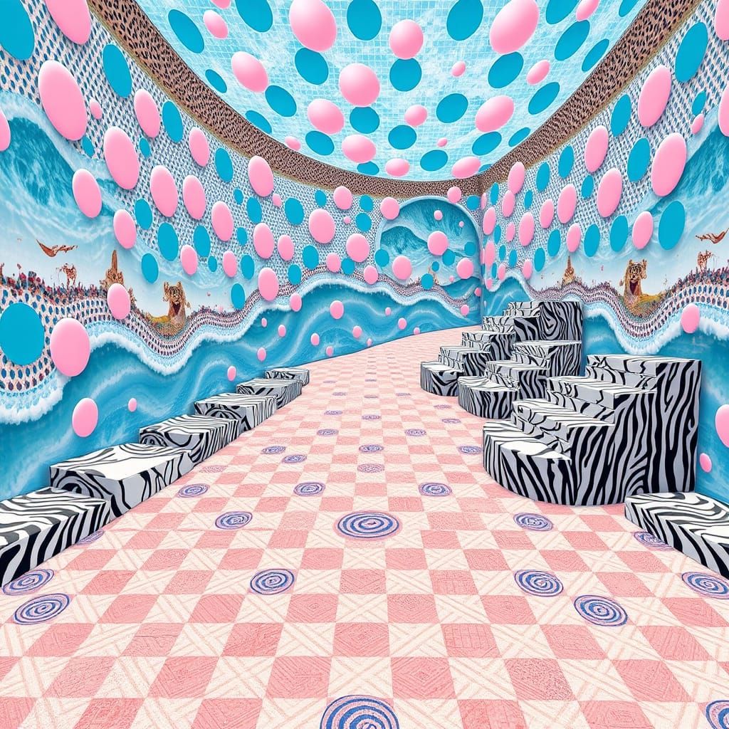 A tessellated pattern of checkerboard floors and stairs creates impossible loops in a beach scene. The artwork combines polka dots, stripes, and geometric shapes in a rhythmic repetition with 3D shading and volumetric lighting.
