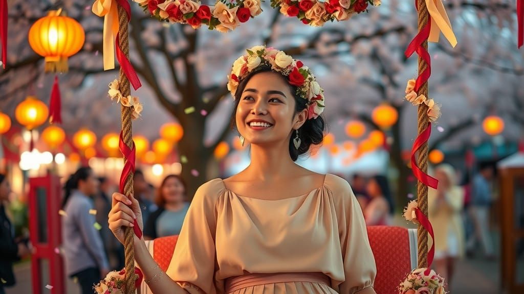 A vivid depiction of a woman in a beige dress and floral crown at a lively festival. This image captures a joyful scene with lanterns, blooming trees, and confetti, radiating warmth and community.
