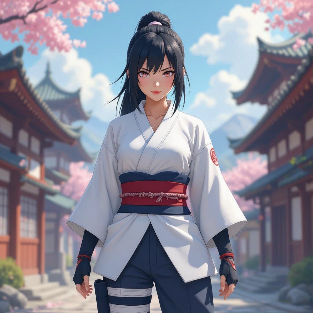 This AI-generated image features Hinata in a stylized, non-explicit anime depiction wearing a white shinobi outfit. Rendered in a 3D anime style with painterly details and vibrant fantasy aesthetics.