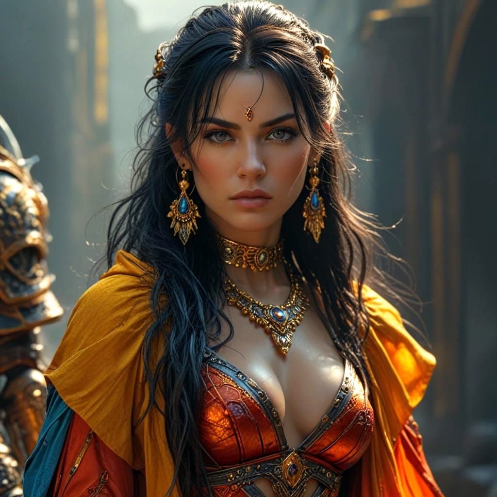 Hyperrealistic portrait of a beautiful muscular woman goddess warrior wearing intricately detailed colorful clothing and futuristic jewellery,