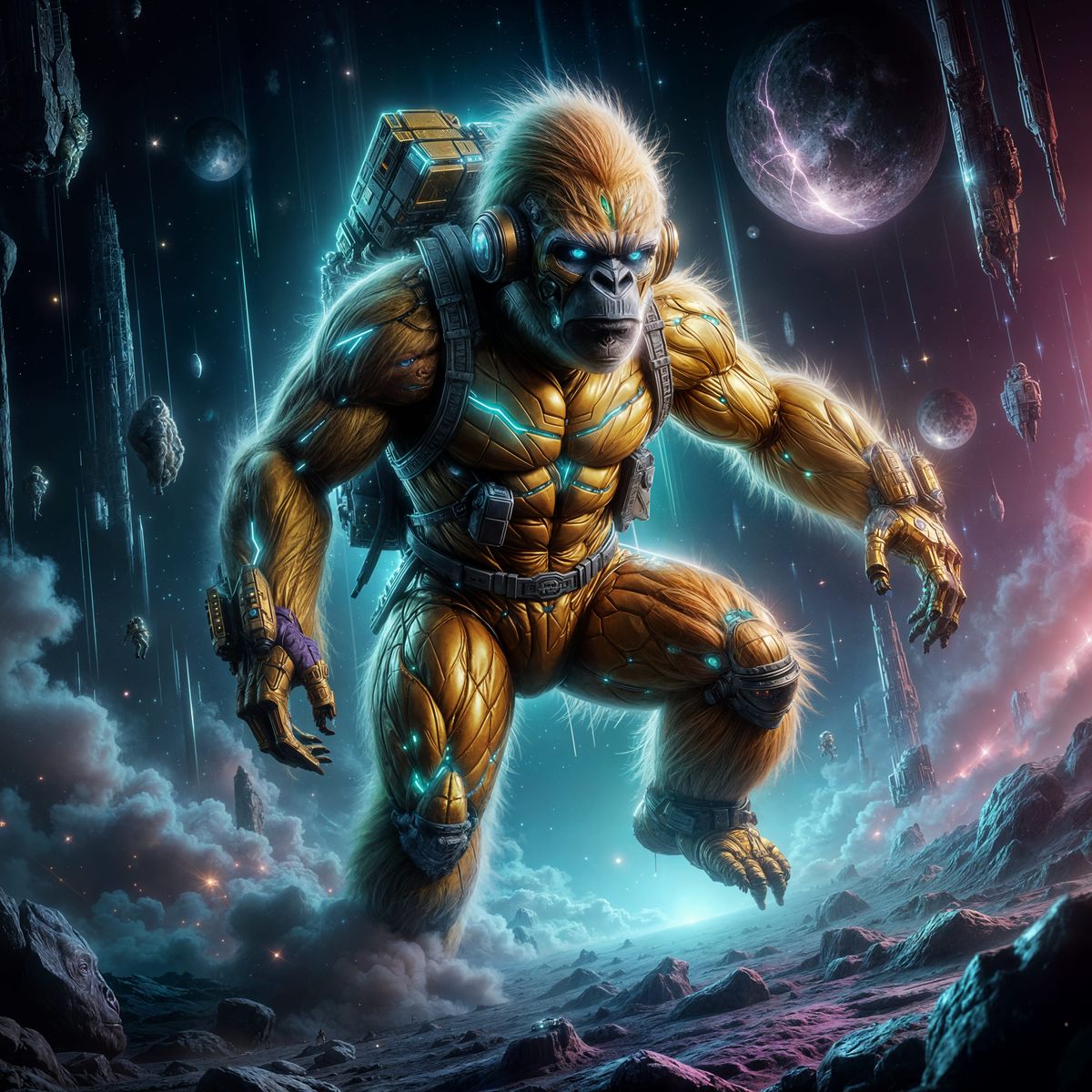 A golden gorilla in astronaut boots leaps from a spacecraft on the Moon. The scene features pink and green galaxies with purple and blue light, in a sci-fi surrealist aesthetic.