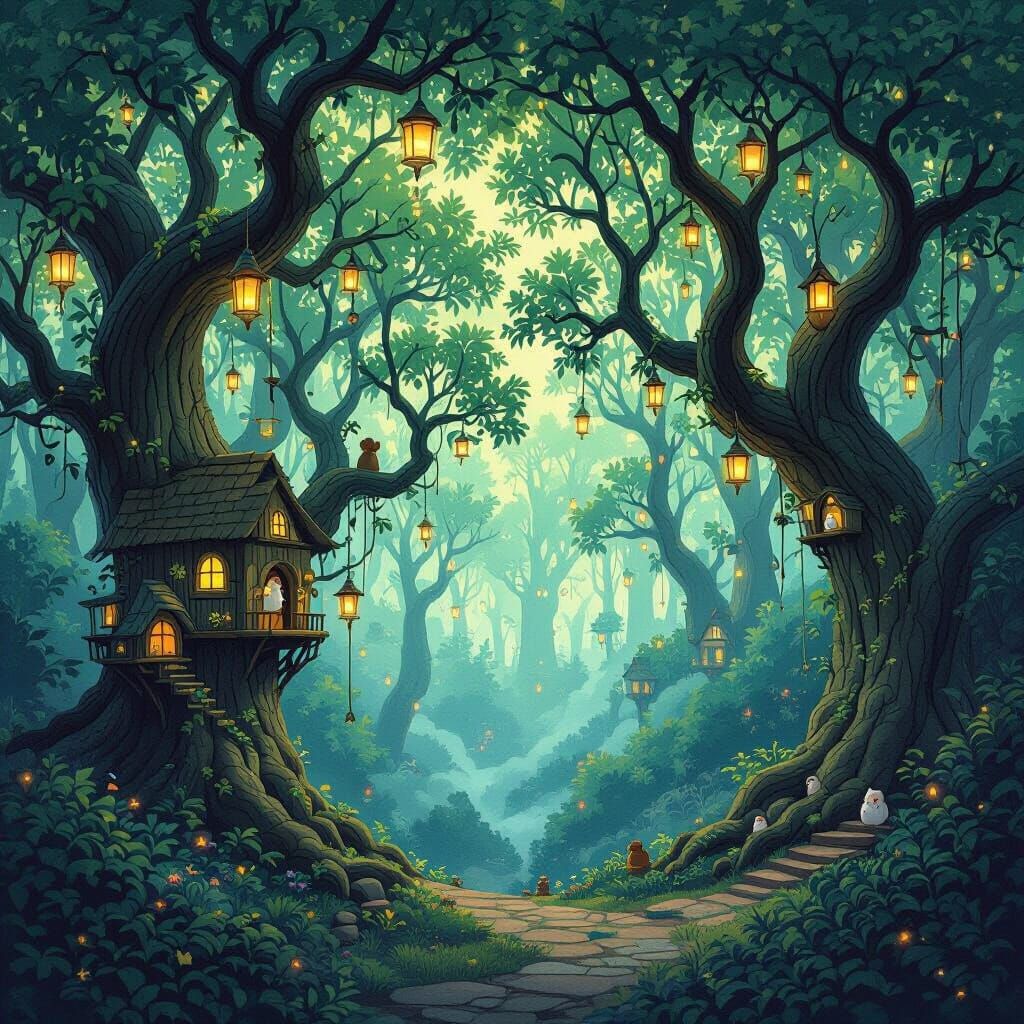 Easily generate magical treehouse villages with glowing lanterns and ancient trees. Try our free AI image maker!