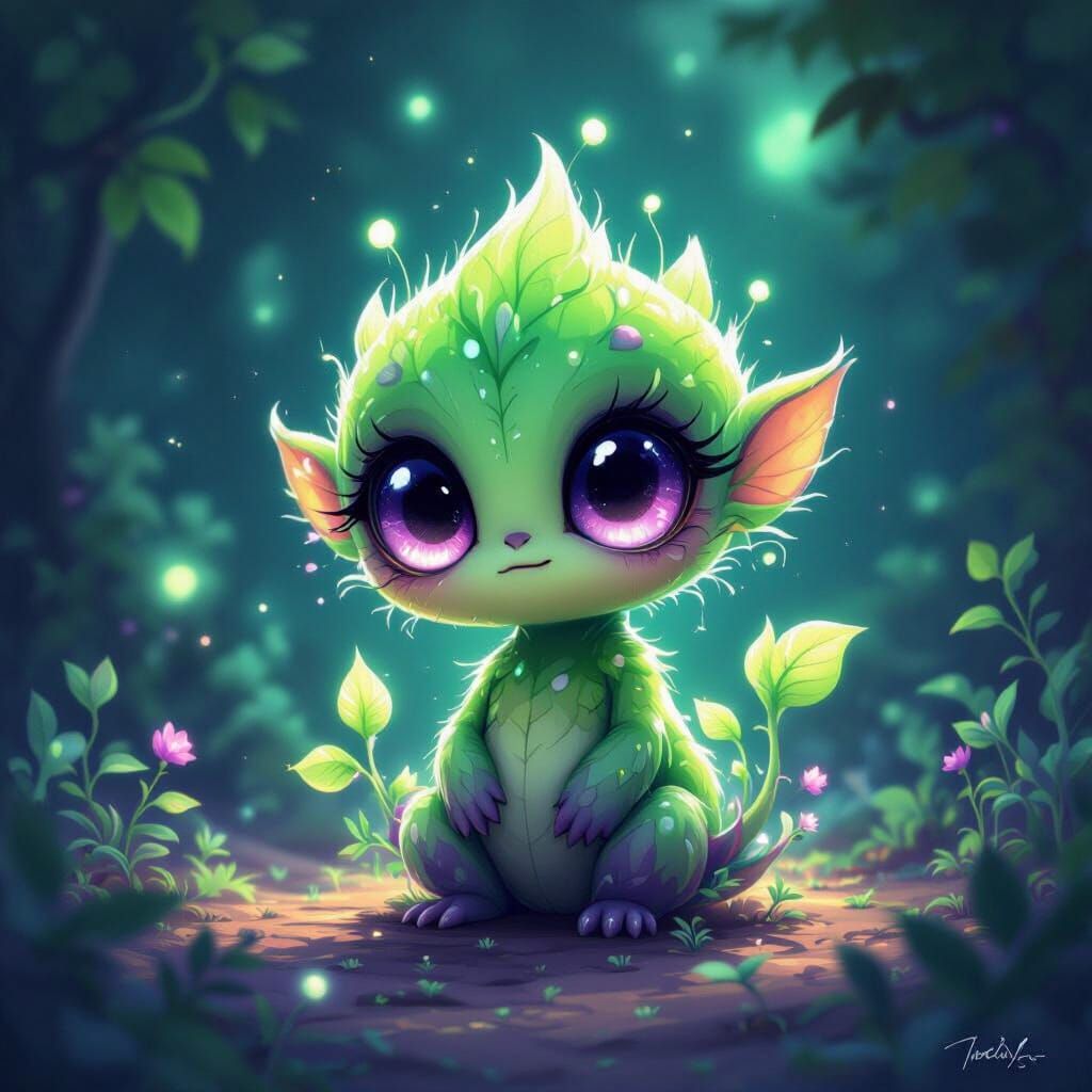 This image shows an adorable alien plant with large eyes, colored green and purple. It has a dangerous aura despite its cute look, illuminated by eerie bioluminescent light in a fantasy art style.