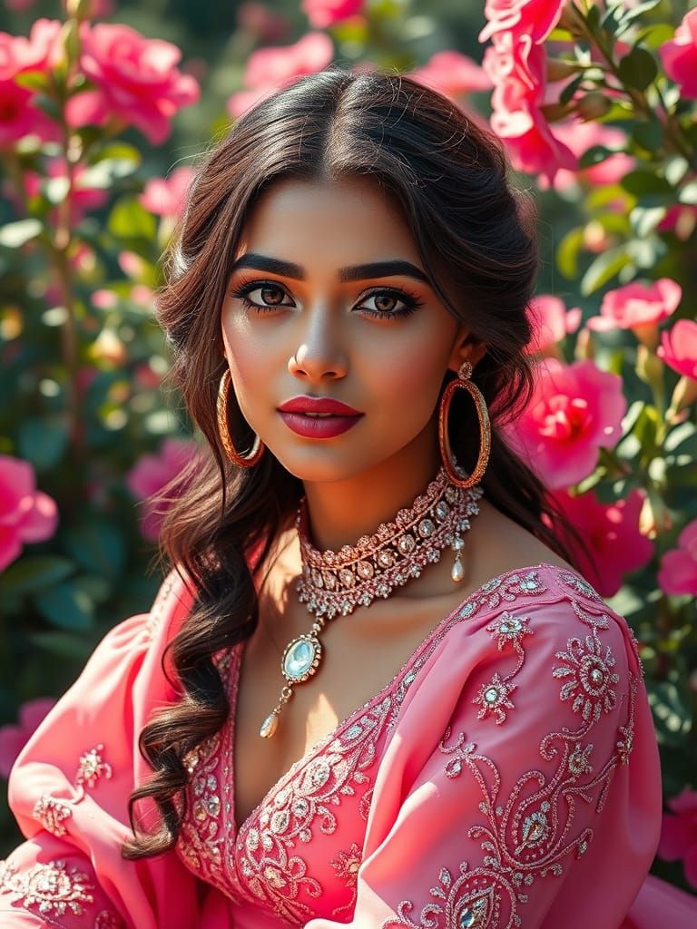 A portrait of a beautiful Iranian girl in a pink diamond dress, seated in a vibrant flower garden. The image is reminiscent of an oil painting with pop art elements, rendered with dynamic and volumetric lighting.