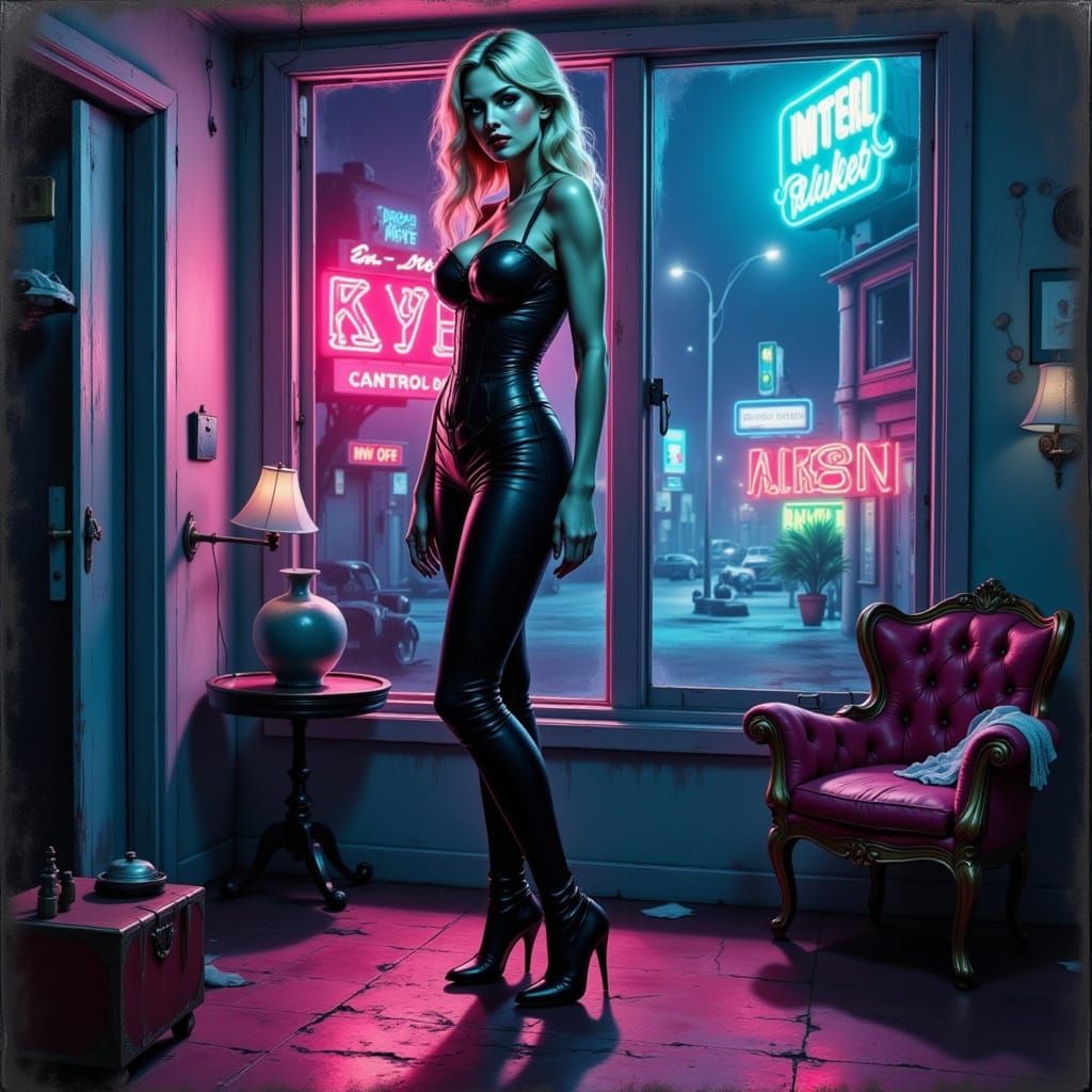 This impressionistic oil painting features a woman in a dimly lit motel room, with vibrant colors and dynamic lighting. The artwork has a retro feel with visible brushstrokes and impasto texture.