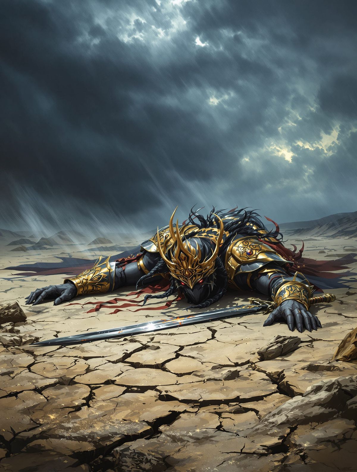 This hyperrealistic image depicts a vanquished Jinn king in golden armor on a desolate battlefield. Dramatic lighting and a dark fantasy aesthetic emphasize his defeat.