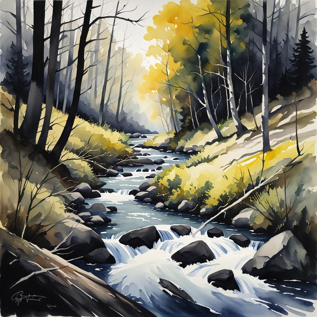 A dramatic watercolor painting of a creek flowing through shadowy woods in spring. The artwork's striking contrasts and dark, moody atmosphere create a somber and intense scene.