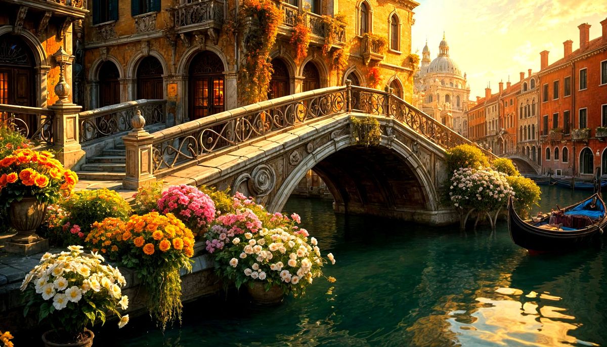 This image is a captivating fantasy novel cover illustration, blending the beauty of a European bridge in Venice with vibrant flowers and a clear canal, reminiscent of a Rembrandt painting, in a style that combines the mystical with the realistic, with intricate details and breathtaking colors.